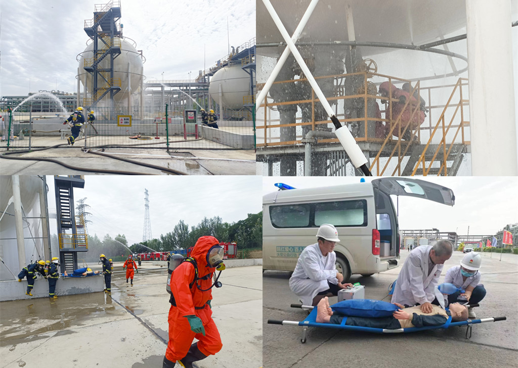 本次演練主要內(nèi)容是:2023年6月28日,金昱元廣拓能源有限公司2#罐區(qū)氯乙烯單體球罐發(fā)生泄露,在裝置處置過程中,搶修人員出現(xiàn)中毒癥狀,隨著泄露量的不斷增大,泄漏點突然起火,造成人員傷亡。在應(yīng)急指揮部的科學(xué)決策、正確指揮下,經(jīng)過廣拓能源公司及多方應(yīng)急救援力量的協(xié)同配合下,這一起危險化學(xué)品泄露燃爆事故最終得到了成功處置。