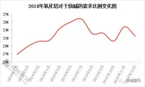 根據(jù)卓創(chuàng)監(jiān)測,2018年氧化鋁對于燒堿的需求占比達(dá)到33%-34%,如上圖所示,2018年大多數(shù)月份氧化鋁行業(yè)對燒堿需求比例均超過30%,其中個別月份最高需求占比達(dá)到35.81%左右,最少的月份需求占比也在27%左右。毫無疑問,氧化鋁是目前燒堿下游需求行業(yè)中的“頂梁柱”般的存在,對燒堿市場起到明顯剛性需求支撐,是燒堿行業(yè)最值得信賴的需求點(diǎn)。