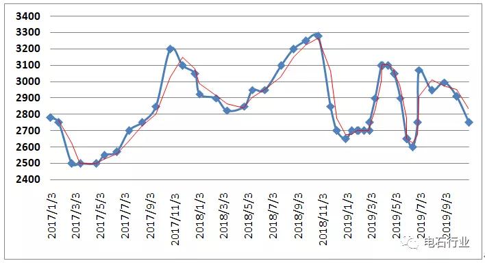 2019年電石市場波動(dòng)不同于2018年,價(jià)格出現(xiàn)了連續(xù)快速的波動(dòng),漲跌幾乎無任何喘息時(shí)間,主要受到供需持續(xù)波動(dòng)的影響。前半年經(jīng)歷大幅漲跌,上漲時(shí)連續(xù)大漲,漲幅超過600元/噸,下跌時(shí)快速下移,降幅跌破成本線后再度下行400元/噸,回吐了全部漲幅;三季度電石價(jià)格呈現(xiàn)“N”字型走勢,先漲后跌再漲,變化幅度略小于上半年:7月價(jià)格前漲后穩(wěn)月底局部小幅下調(diào),多數(shù)時(shí)間慣性上漲200-300元/噸,隨后月底局部價(jià)格下調(diào)50元/噸左右;8月份價(jià)格下行200-300元/噸,回吐前期漲幅;9月份價(jià)格再度反彈,至月底已反彈了150-250元/噸不等;10月電石價(jià)格再次極速下滑300元/噸,1-10月電石價(jià)格呈現(xiàn)“M”字型,回落到當(dāng)前主流價(jià)格的2550-2650元/噸。