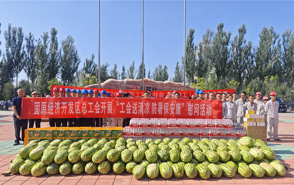 當(dāng)青銅峽市委、政府和固原經(jīng)濟(jì)開(kāi)發(fā)區(qū)總工會(huì)的領(lǐng)導(dǎo)為金昱元股份公司奮戰(zhàn)在生產(chǎn)一線的員工們送上西瓜、飲料、茶葉、冰糖等防暑物品的時(shí)候,廣大員工對(duì)上級(jí)政府部門領(lǐng)導(dǎo)的關(guān)心和厚愛(ài)深表感謝。炎炎夏日,上級(jí)政府部門送來(lái)的關(guān)愛(ài)使員工們?nèi)玢宕猴L(fēng),深受感動(dòng)。